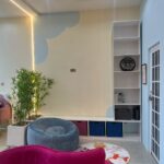 At the heart of the nursery is a custom-made baby bed that adapts as the child grows, paired with a baby dresser and a milestone measurement wall — perfect for capturing memories as the child develops. The design is elevated with elegant wall finishes, cornices, and fluted details that add sophistication to the cozy space.